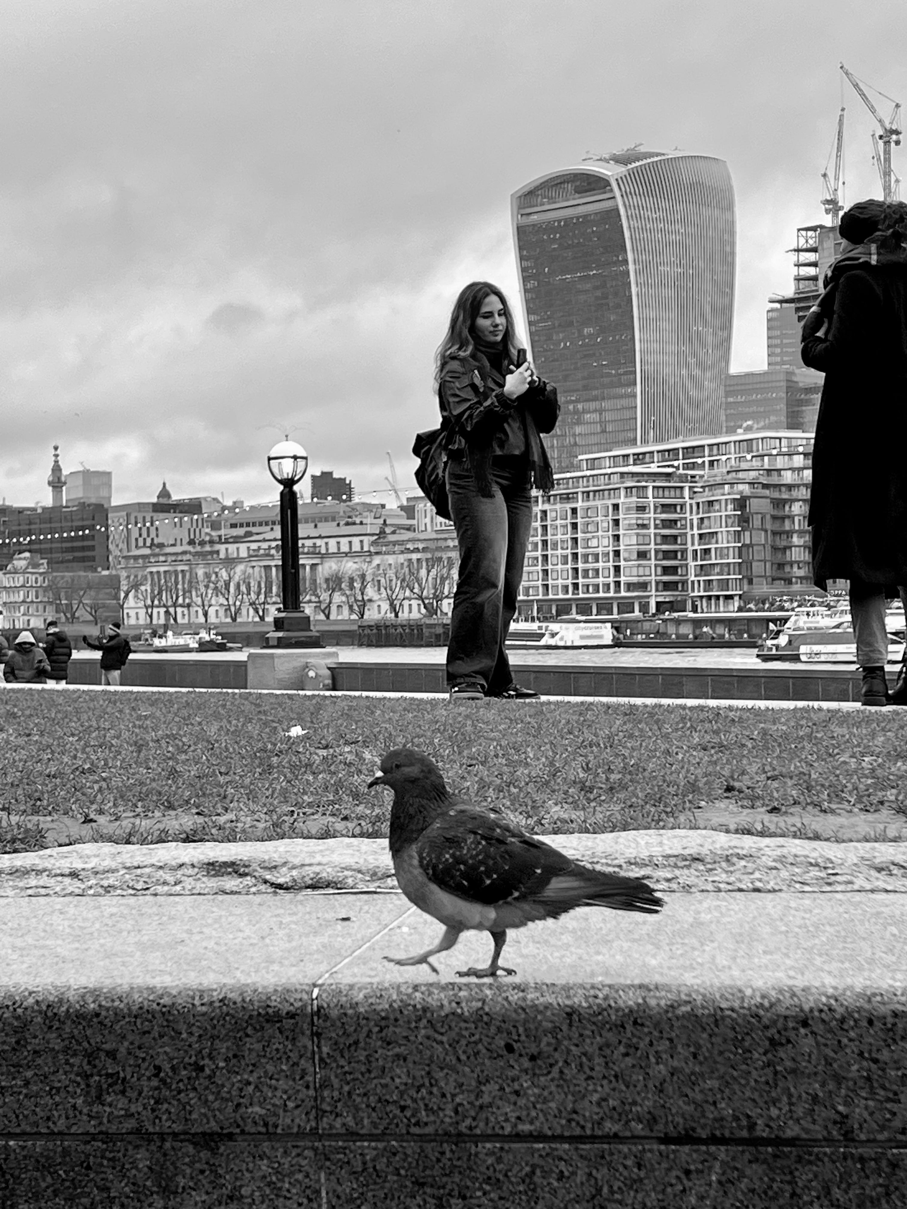 My favourite image from this set is probably the one with the pigeon. It has the fewest elements in three distinct layers (although, if you had been able to stage manage it, I would have shifted the woman slightly to the left, between the lamp and the building).